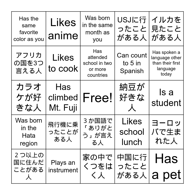 This bingo card has a free space and 28 words: ヨーロッパで生まれた人, Likes spicy food, Can count to 5 in Spanish, 中国に行ったことがある人, アフリカの国を3つ言える人, Was born in the same month as you, Likes anime, Was born in the Hata region, 納豆が好きな人, 2つ以上の国に住んだことがある人, カラオケが好きな人, USJに行ったことがある人, Plays an instrument, 家の中でくつをはく人, Has spoken a language other than their first language today, 新しいことにチャレンジするのが好きな人, 飛行機に乗ったことがある人, Likes to cook, Has attended school in two or more countries, 3か国語で「ありがとう」が言える人, Has the same favorite color as you, 北海道に行ったことがある人, Has a pet, Has climbed Mt. Fuji, Is a student, Likes school lunch, イルカを見たことがある人 and シュノーケリングをやったことがある人.