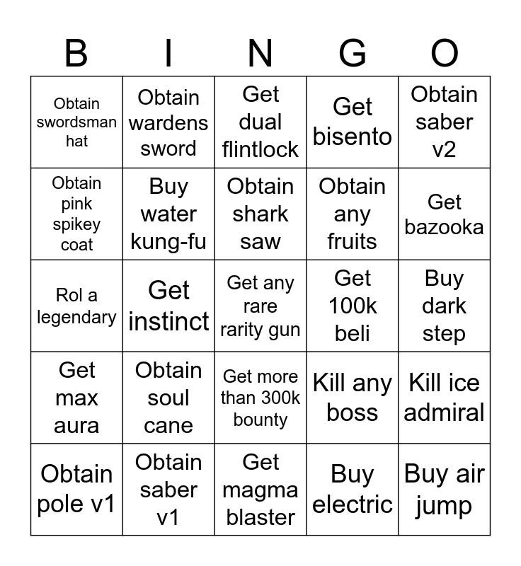This bingo card has a free space and 24 words: Obtain soul cane, Obtain saber v1, Obtain shark saw, Obtain pole v1, Obtain saber v2, Obtain swordsman hat, Obtain pink spikey coat, Obtain wardens sword, Get 100k beli, Get more than 300k bounty, Obtain any fruits, Rol a legendary, Kill any boss, Kill ice admiral, Buy water kung-fu, Buy electric, Buy dark step, Get dual flintlock, Get bazooka, Get instinct, Buy air jump, Get max aura, Get bisento and Get magma blaster.