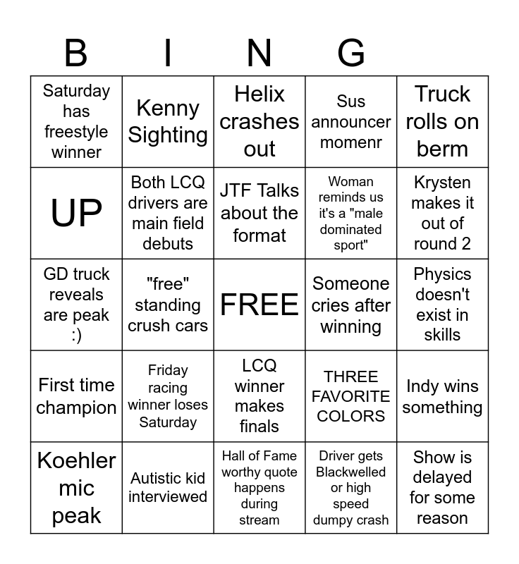 This bingo card has a free space and 24 words: Friday racing winner loses Saturday, Autistic kid interviewed, JTF Talks about the format, Koehler mic peak, Truck rolls on berm, Saturday has freestyle winner, UP, Kenny Sighting, Someone cries after winning, LCQ winner makes finals, Woman reminds us it's a "male dominated sport", GD truck reveals are peak :), THREE FAVORITE COLORS, Indy wins something, Both LCQ drivers are main field debuts, Driver gets Blackwelled or high speed dumpy crash, Physics doesn't exist in skills, Helix crashes out, Krysten makes it out of round 2, "free" standing crush cars, Show is delayed for some reason, First time champion, Sus announcer momenr and Hall of Fame worthy quote happens during stream.