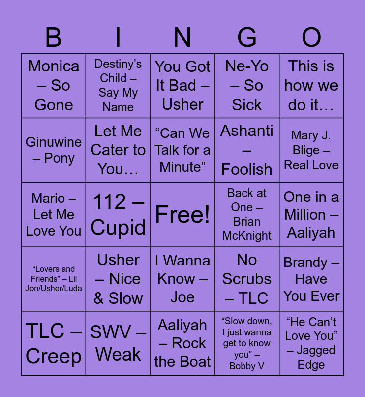 This bingo card has a free space and 25 words: Usher – Nice & Slow, Aaliyah – Rock the Boat, “Can We Talk for a Minute”, TLC – Creep, This is how we do it…, Monica – So Gone, Ginuwine – Pony, Destiny’s Child – Say My Name, Back at One – Brian McKnight, I Wanna Know – Joe, Ashanti – Foolish, Mario – Let Me Love You, No Scrubs – TLC, Brandy – Have You Ever, Let Me Cater to You…, Jagged Edge – Let’s Get Married, One in a Million – Aaliyah, You Got It Bad – Usher, Mary J. Blige – Real Love, 112 – Cupid, “He Can’t Love You” – Jagged Edge, SWV – Weak, “Lovers and Friends” – Lil Jon/Usher/Luda, Ne-Yo – So Sick and “Slow down, I just wanna get to know you” – Bobby V.