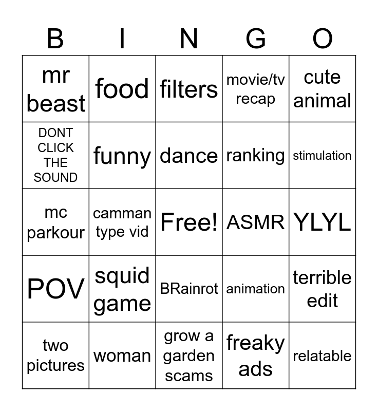 This bingo card has a free space and 24 words: squid game, woman, dance, two pictures, cute animal, mr beast, DONT CLICK THE SOUND, food, ASMR, BRainrot, ranking, mc parkour, animation, terrible edit, funny, freaky ads, YLYL, filters, stimulation, camman type vid, relatable, POV, movie/tv recap and grow a garden scams.