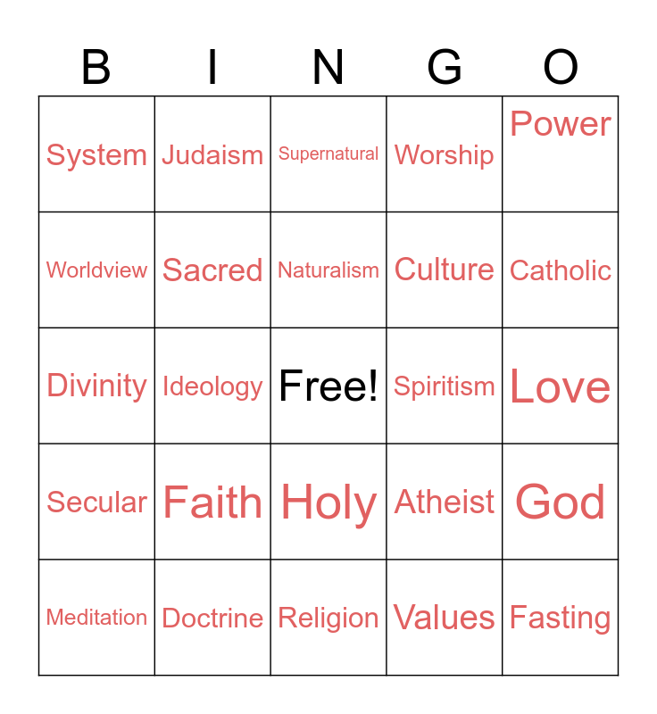 This bingo card has a free space and 50 words: Prayer, Fasting, Reincarnation, Religion, Faith, Hinduism, Judaism, Beliefs, Worldview, Christianity, Sacred, Worship, God, Atheist, Pantheism, Polytheism, Naturalism, Spiritism, Rituals, Power, Ideology, Values, System, Culture, Salvation, Islam, Catholic, Sinful acts, Supernatural, Holy, Praise, Life, Theology, Philosophy, Doctrine, gods and godesses, Communion, Devotion, Bible, Love, Church, Fellowship, Ceremonies, Deity, Meditation, Divinity, Relationship, Saints, Secular and Human being.