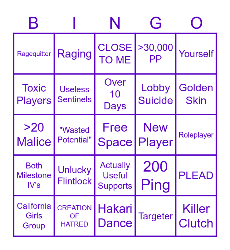 This bingo card has a free space and 24 words: Unlucky Flintlock, CREATION OF HATRED, Over 10 Days, California Girls Group, Yourself, Ragequitter, Toxic Players, Raging, New Player, Actually Useful Supports, Lobby Suicide, >20 Malice, 200 Ping, PLEAD, Useless Sentinels, Targeter, Roleplayer, CLOSE TO ME, Golden Skin, "Wasted Potential", Killer Clutch, Both Milestone IV's, >30,000 PP and Hakari Dance.