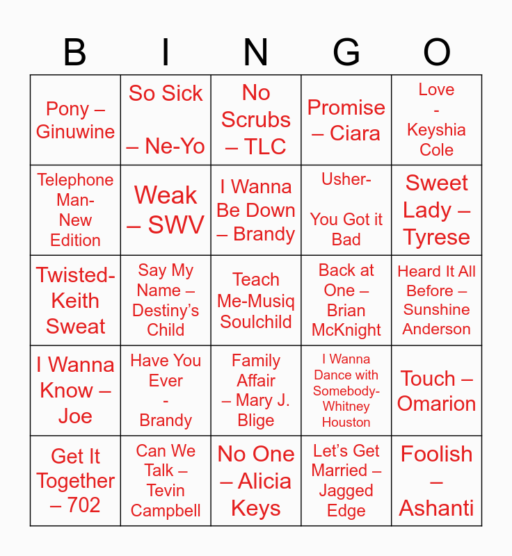 This bingo card has 30 words: Can We Talk – Tevin Campbell, So Anxious – Ginuwine, Say My Name – Destiny’s Child, Let Me Love You – Mario, Pony – Ginuwine, No Scrubs – TLC, Weak – SWV, Family Affair – Mary J. Blige, Back at One – Brian McKnight, No One – Alicia Keys, Heard It All Before – Sunshine Anderson, Teach Me-Musiq Soulchild, Let’s Get Married – Jagged Edge, Foolish – Ashanti, Sweet Lady – Tyrese, Differences – Ginuwine, I Wanna Dance with Somebody- Whitney Houston, I Wanna Know – Joe, Have You Ever - Brandy, Love - Keyshia Cole, Twisted- Keith Sweat, We Belong Together- Mariah Carey, So Sick – Ne-Yo, Usher- You Got it Bad, Telephone Man- New Edition, Promise – Ciara, Touch – Omarion, Get It Together – 702, I Wanna Be Down – Brandy and Knockin’ da Boots – H-Town.