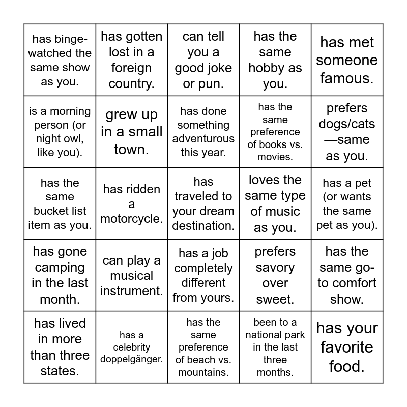 This bingo card has a free space and 39 words: went to a different college than you., was born in the same month as you., was born in a different state than you., grew up in a small town., has lived in more than three states., has a job completely different from yours., has done something adventurous this year., has been on a cruise., has met someone famous., has gone camping in the last month., has ridden a motorcycle., has the same hobby as you., has your favorite food., has a pet (or wants the same pet as you)., loves the same type of music as you., can play a musical instrument., loves the same sports team as you., has binge-watched the same show as you., enjoys the same type of board games., prefers savory over sweet., is a morning person (or night owl, like you)., has the same preference of beach vs. mountains., has the same preference of books vs. movies., prefers dogs/cats—same as you., would pick the same last meal as you., is more introverted or extroverted—same as you., has a side hustle or passion project., has the same favorite holiday as you., can wiggle their ears or raise one eyebrow., has gotten lost in a foreign country., can do an impression or funny voice., has watched the same childhood cartoon as you., can tell you a good joke or pun., has a celebrity doppelgänger., been to a national park in the last three months., has read the same book as you., has the same go-to comfort show., has the same bucket list item as you. and the same season of the year as you..