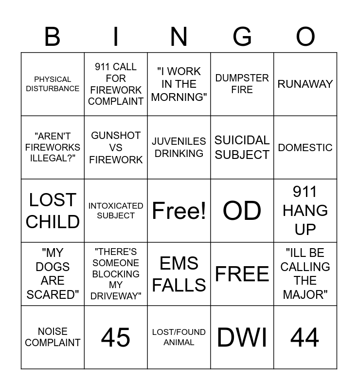 This bingo card has a free space and 25 words: "THERE'S SOMEONE BLOCKING MY DRIVEWAY", LOST/FOUND ANIMAL, JUVENILES DRINKING, NOISE COMPLAINT, RUNAWAY, PHYSICAL DISTURBANCE, "AREN'T FIREWORKS ILLEGAL?", 911 CALL FOR FIREWORK COMPLAINT, OD, EMS FALLS, SUICIDAL SUBJECT, LOST CHILD, FREE, "ILL BE CALLING THE MAJOR", GUNSHOT VS FIREWORK, EMS BURN, 911 HANG UP, "I WORK IN THE MORNING", DOMESTIC, INTOXICATED SUBJECT, 44, 45, "MY DOGS ARE SCARED", DUMPSTER FIRE and DWI.