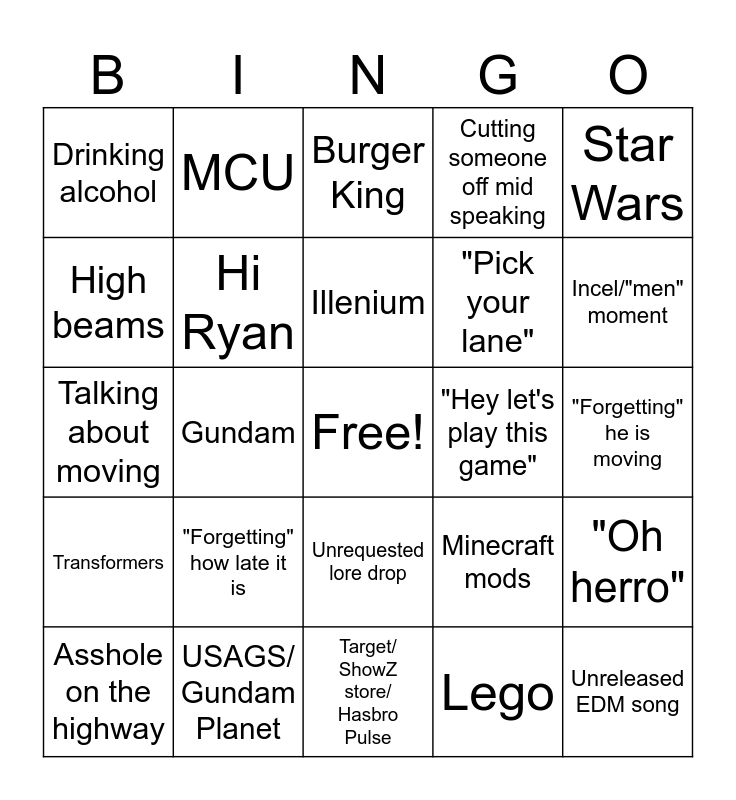 This bingo card has a free space and 24 words: "Forgetting" how late it is, USAGS/ Gundam Planet, Illenium, Asshole on the highway, Star Wars, Drinking alcohol, High beams, MCU, "Hey let's play this game", Unrequested lore drop, "Pick your lane", Talking about moving, Minecraft mods, "Oh herro", Hi Ryan, Lego, "Forgetting" he is moving, Burger King, Incel/"men" moment, Gundam, Unreleased EDM song, Transformers, Cutting someone off mid speaking and Target/ ShowZ store/ Hasbro Pulse.