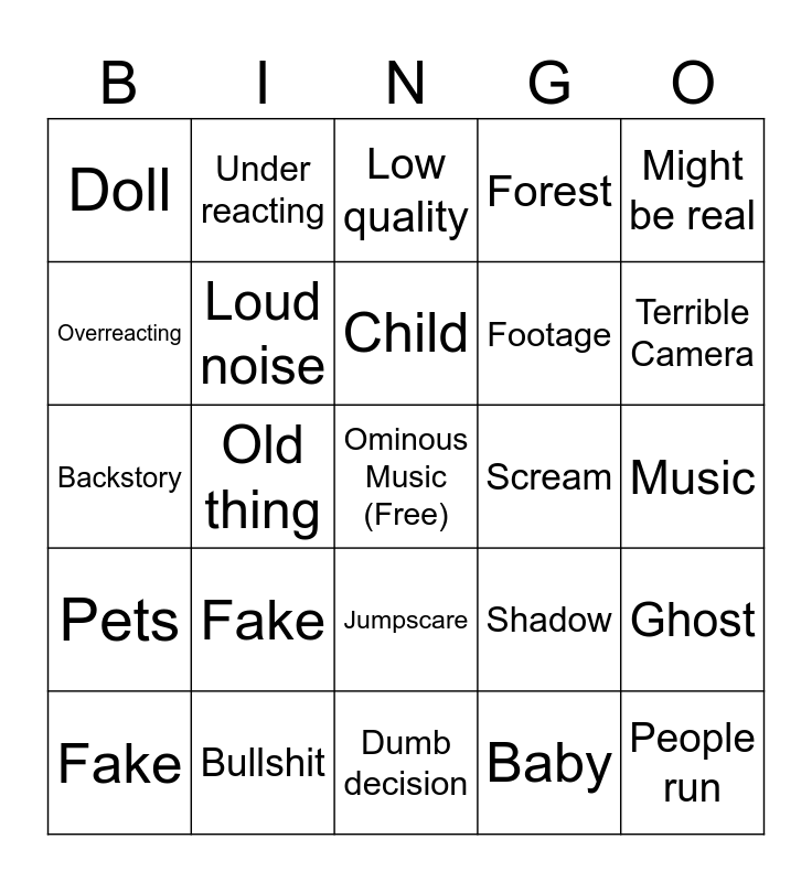 This bingo card has a free space and 24 words: Fake, Bullshit, Child, Fake, Might be real, Doll, Overreacting, Under reacting, Scream, Jumpscare, Footage, Backstory, Shadow, Ghost, Loud noise, Baby, Music, Low quality, Terrible Camera, Old thing, People run, Pets, Forest and Dumb decision.