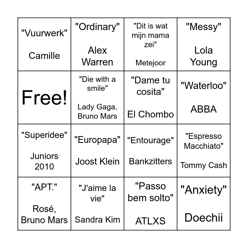 This bingo card has 16 words: "J'aime la vie" Sandra Kim, "Espresso Macchiato" Tommy Cash, "Dit is wat mijn mama zei" Metejoor, "Vuurwerk" Camille, "Superidee" Juniors 2010, "Ordinary" Alex Warren, "Entourage" Bankzitters, "Passo bem solto" ATLXS, Free!, "Die with a smile" Lady Gaga, Bruno Mars, "APT." Rosé, Bruno Mars, "Messy" Lola Young, "Europapa" Joost Klein, "Waterloo" ABBA, "Dame tu cosita" El Chombo and "Anxiety" Doechii.