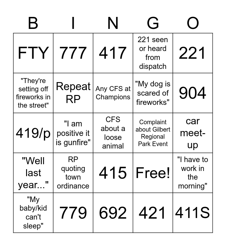This bingo card has 25 words: RP quoting town ordinance, 692, Any CFS at Champions, "My baby/kid can't sleep", 221, FTY, "They're setting off fireworks in the street", 777, Complaint about Gilbert Regional Park Event, 415, "My dog is scared of fireworks", 419/p, Free!, "I have to work in the morning", Repeat RP, 411S, car meet-up, 417, 904, "I am positive it is gunfire", CFS about a loose animal, 779, "Well last year...", 221 seen or heard from dispatch and 421.