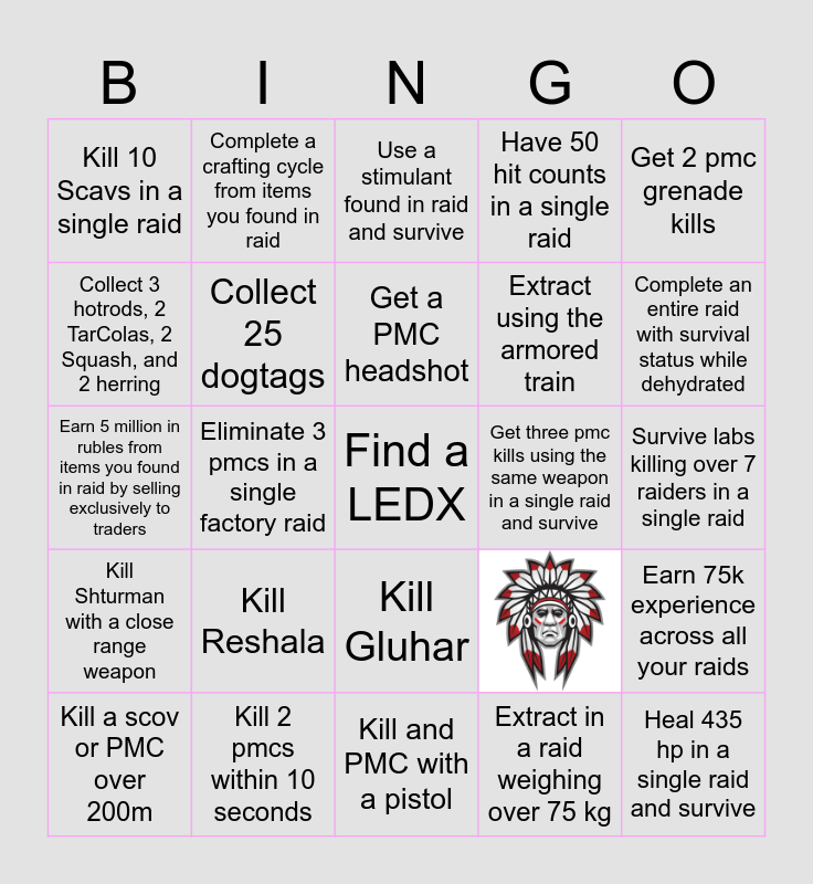 This bingo card has 1 images and 24 words: Kill Reshala, Kill and PMC with a pistol, Get a PMC headshot, Kill a scov or PMC over 200m, Get 2 pmc grenade kills, Kill 10 Scavs in a single raid, Collect 3 hotrods, 2 TarColas, 2 Squash, and 2 herring, Complete a crafting cycle from items you found in raid, Get three pmc kills using the same weapon in a single raid and survive, Kill Gluhar, Extract using the armored train, Earn 5 million in rubles from items you found in raid by selling exclusively to traders, Earn 75k experience across all your raids, Collect 25 dogtags, Heal 435 hp in a single raid and survive, Survive labs killing over 7 raiders in a single raid, Use a stimulant found in raid and survive, Complete an entire raid with survival status while dehydrated, Eliminate 3 pmcs in a single factory raid, Find a LEDX, Kill 2 pmcs within 10 seconds, Kill Shturman with a close range weapon, Have 50 hit counts in a single raid and Extract in a raid weighing over 75 kg.