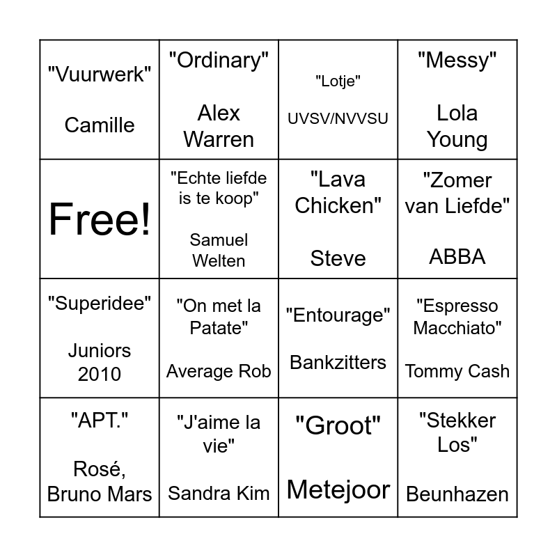 This bingo card has 16 words: "J'aime la vie" Sandra Kim, "Espresso Macchiato" Tommy Cash, "Lotje" UVSV/NVVSU, "Vuurwerk" Camille, "Superidee" Juniors 2010, "Ordinary" Alex Warren, "Entourage" Bankzitters, "Groot" Metejoor, Free!, "Echte liefde is te koop" Samuel Welten, "APT." Rosé, Bruno Mars, "Messy" Lola Young, "On met la Patate" Average Rob, "Zomer van Liefde" ABBA, "Lava Chicken" Steve and "Stekker Los" Beunhazen.