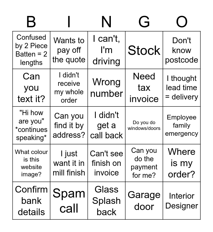 This bingo card has 25 words: I just want it in mill finish, Glass Splash back, Wrong number, Confirm bank details, Don't know postcode, Confused by 2 Piece Batten = 2 lengths, Can you text it?, Wants to pay off the quote, Do you do windows/doors, Can't see finish on invoice, Need tax invoice, "Hi how are you" *continues speaking*, Can you do the payment for me?, Where is my order?, I didn't receive my whole order, Interior Designer, Employee family emergency, I can't, I'm driving, I thought lead time = delivery, Can you find it by address?, I didn't get a call back, Spam call, What colour is this website image?, Stock and Garage door.