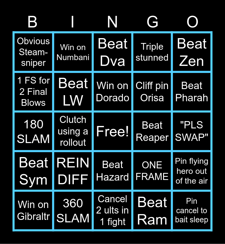 This bingo card has a free space and 34 words: Beat Orisa, Beat Ram, Beat Mei, Beat Bastion, Beat Sym, Beat LW, Beat Zen, Win on Gibraltr, Win on Numbani, Win on Paraiso, Win on Dorado, Beat Dva, Beat Ball, Beat Doom, Beat Reaper, Beat Pharah, 360 SLAM, 180 SLAM, REIN DIFF, ONE FRAME, Beat Hazard, Win with Mercy OTP on team, Obvious Steam-sniper, "PLS SWAP", Cancel 2 ults in 1 fight, Pin cancel to bait sleep, Triple stunned, Fakeout Slam, Cliff pin Orisa, 1 FS for 2 Final Blows, 5 Shattered, Clutch using a rollout, Pin flying hero out of the air and Use 1 pin to knock 2 or more off the map.