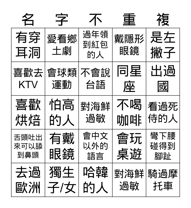 This bingo card has a free space and 24 words: 有戴眼鏡, 獨生子/女, 不會說台語, 去過歐洲, 是左撇子, 有穿耳洞, 喜歡去KTV, 愛看鄉土劇, 不喝咖啡, 會中文以外的語言, 同星座, 喜歡烘焙, 會玩桌遊, 彎下腰碰得到腳趾, 會球類運動, 對海鮮過敏, 看過死侍的人, 過年領到紅包的人, 出過國, 怕高的人, 騎過摩托車, 舌頭吐出來可以舔到鼻頭, 戴隱形眼鏡 and 哈韓的人.