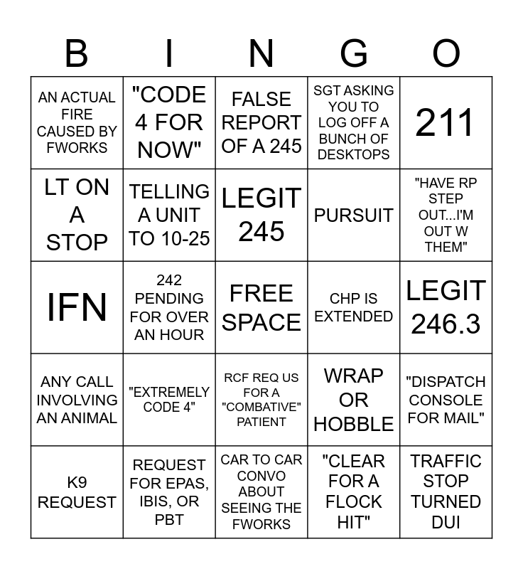 This bingo card has a free space and 24 words: "EXTREMELY CODE 4", REQUEST FOR EPAS, IBIS, OR PBT, LEGIT 245, K9 REQUEST, 211, AN ACTUAL FIRE CAUSED BY FWORKS, LT ON A STOP, "CODE 4 FOR NOW", CHP IS EXTENDED, RCF REQ US FOR A "COMBATIVE" PATIENT, PURSUIT, IFN, WRAP OR HOBBLE, "DISPATCH CONSOLE FOR MAIL", TELLING A UNIT TO 10-25, "CLEAR FOR A FLOCK HIT", LEGIT 246.3, FALSE REPORT OF A 245, "HAVE RP STEP OUT...I'M OUT W THEM", 242 PENDING FOR OVER AN HOUR, TRAFFIC STOP TURNED DUI, ANY CALL INVOLVING AN ANIMAL, SGT ASKING YOU TO LOG OFF A BUNCH OF DESKTOPS and CAR TO CAR CONVO ABOUT SEEING THE FWORKS.