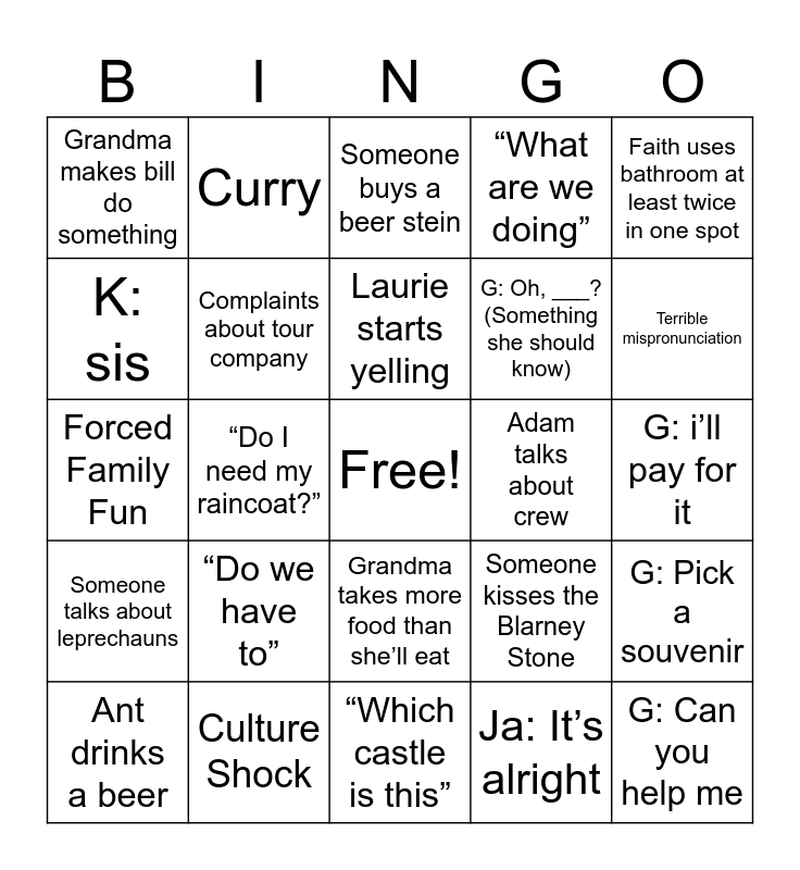 This bingo card has a free space and 28 words: G: Pick a souvenir, D: British Accent, G: Oh, ___? (Something she should know), Ja: It’s alright, K: sis, Someone buys a beer stein, Curry, Someone talks about leprechauns, Adam talks about crew, Ant drinks a beer, Forced Family Fun, “What are we doing”, Culture Shock, “Which castle is this”, Terrible mispronunciation, Where are we, “Do we have to”, Complaints about tour company, Laurie starts yelling, Grandma takes more food than she’ll eat, Grandma makes bill do something, Wifi problems, G: Can you help me, “Do I need my raincoat?”, G: i’ll pay for it, Someone kisses the Blarney Stone, Faith uses bathroom at least twice in one spot and Can you believe there’s no AC?.
