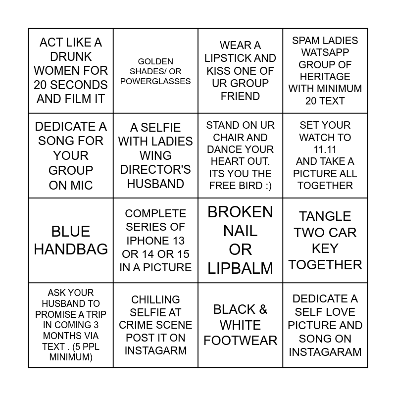This bingo card has 16 words: CHILLING SELFIE AT CRIME SCENE POST IT ON INSTAGARM, TANGLE TWO CAR KEY TOGETHER, WEAR A LIPSTICK AND KISS ONE OF UR GROUP FRIEND, ACT LIKE A DRUNK WOMEN FOR 20 SECONDS AND FILM IT, BLUE HANDBAG, GOLDEN SHADES/ OR POWERGLASSES, BROKEN NAIL OR LIPBALM, BLACK & WHITE FOOTWEAR, DEDICATE A SONG FOR YOUR GROUP ON MIC, A SELFIE WITH LADIES WING DIRECTOR'S HUSBAND, ASK YOUR HUSBAND TO PROMISE A TRIP IN COMING 3 MONTHS VIA TEXT . (5 PPL MINIMUM), SPAM LADIES WATSAPP GROUP OF HERITAGE WITH MINIMUM 20 TEXT, COMPLETE SERIES OF IPHONE 13 OR 14 OR 15 IN A PICTURE, SET YOUR WATCH TO 11.11 AND TAKE A PICTURE ALL TOGETHER, STAND ON UR CHAIR AND DANCE YOUR HEART OUT. ITS YOU THE FREE BIRD :) and DEDICATE A SELF LOVE PICTURE AND SONG ON INSTAGARAM.