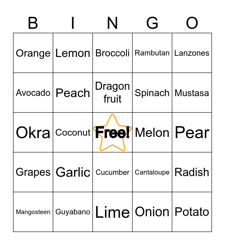 This bingo card has a free space and 73 words: Apple, Banana, Orange, Mango, Pineapple, Papaya, Grapes, Watermelon, Cantaloupe, Strawberry, Blueberry, Cherry, Peach, Pear, Guava, Lemon, Lime, Avocado, Tomato, Melon, Dragon fruit, Rambutan, Lanzones, Santol, Mangosteen, Calamansi, Durian, Jackfruit, Star apple, Tamarind, Guyabano, Lychee, Sineguelas, Passion fruit, Coconut, Pomelo, Plum, Carrot, Potato, Sweet potato, Onion, Garlic, Ginger, Cabbage, Lettuce, Spinach, Broccoli, Cauliflower, Eggplant, Okra, Bitter gourd, Squash, Chayote, Green beans, String bean, Bell pepper, Chili pepper, Cucumber, Tomato, Corn, Peas, Kangkong, Malunggay, Mustasa, Upo, Patola, Taro, Yam, Radish, Bok choy, Pechay, Leeks and Celery.