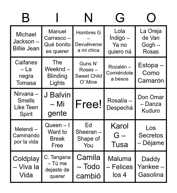 This bingo card has a free space and 44 words: Pablo López – El patio, Daddy Yankee – Gasolina, Alejandro Sanz – Corazón partío, Coldplay – Viva la Vida, Maná – Rayando el sol, Maluma – Felices los 4, Hombres G – Devuélveme a mi chica, Jarabe de Palo – La flaca, La Oreja de Van Gogh – Rosas, C. Tangana – Tú me dejaste de querer, Lola Índigo – Ya no quiero ná, Rosalía – Despechá, Ed Sheeran – Shape of You, Queen – I Want to Break Free, Rauw & Rosalía – Beso, Camila – Todo cambió, Carlos Vives – La bicicleta, Nirvana – Smells Like Teen Spirit, Mecano – Hijo de la luna, Estopa – Como Camarón, Manuel Carrasco – Qué bonito es querer, Shakira & Bizarrap – Music Session Vol. 53, Aitana – Vas a quedarte, Michael Jackson – Billie Jean, Vetusta Morla – Copenhague, Don Omar – Danza Kuduro, Reik – Me niego, Soda Stereo – De música ligera, Karol G – Tusa, Melendi – Caminando por la vida, Fito & Fitipaldis – Soldadito marinero, Los Secretos – Déjame, Oasis – Wonderwall, Amaral – Cómo hablar, J Balvin – Mi gente, Nacha Pop – La chica de ayer, Juanes – A Dios le pido, Lady Gaga – Shallow, Guns N’ Roses – Sweet Child O’ Mine, Caifanes – La negra Tomasa, Rozalén – Comiéndote a besos, Enrique Iglesias – Bailando, The Weeknd – Blinding Lights and Leiva – Terriblemente cruel.