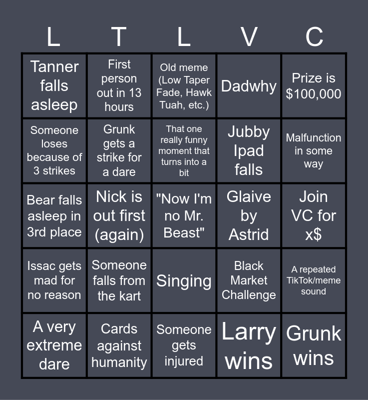 This bingo card has a free space and 24 words: Someone falls from the kart, Cards against humanity, That one really funny moment that turns into a bit, A very extreme dare, Prize is $100,000, Tanner falls asleep, Someone loses because of 3 strikes, First person out in 13 hours, Glaive by Astrid, Singing, Jubby Ipad falls, Bear falls asleep in 3rd place, Black Market Challenge, A repeated TikTok/meme sound, Grunk gets a strike for a dare, Larry wins, Join VC for x$, Old meme (Low Taper Fade, Hawk Tuah, etc.), Malfunction in some way, Nick is out first (again), Grunk wins, Issac gets mad for no reason, Dadwhy and Someone gets injured.