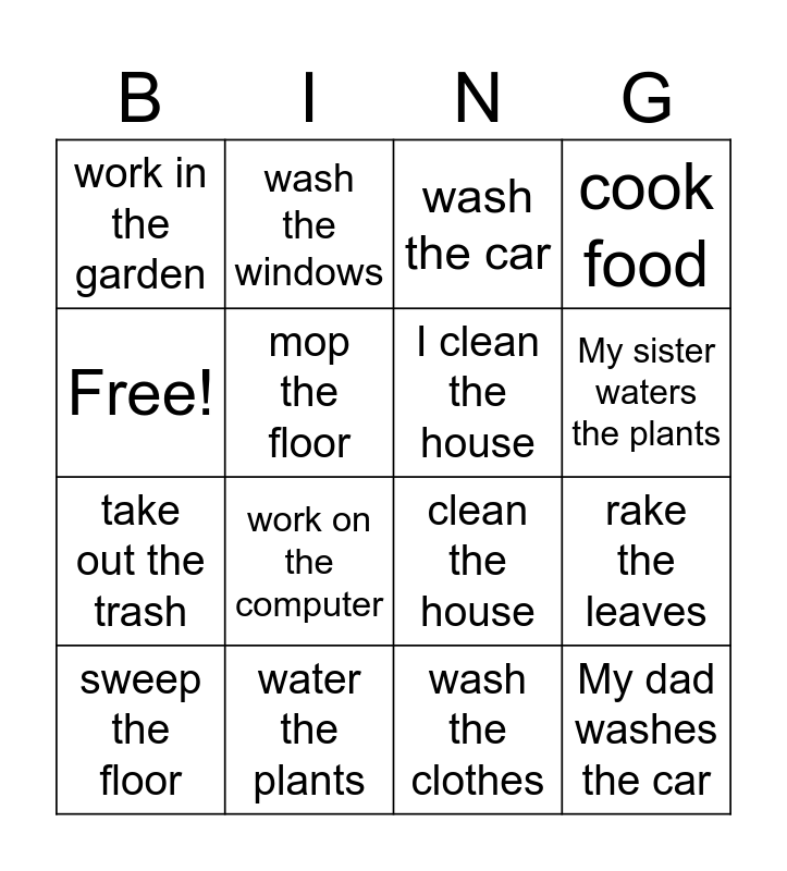 This bingo card has 16 words: water the plants, rake the leaves, wash the car, work in the garden, take out the trash, wash the windows, clean the house, wash the clothes, Free!, mop the floor, sweep the floor, cook food, work on the computer, My sister waters the plants, I clean the house and My dad washes the car.