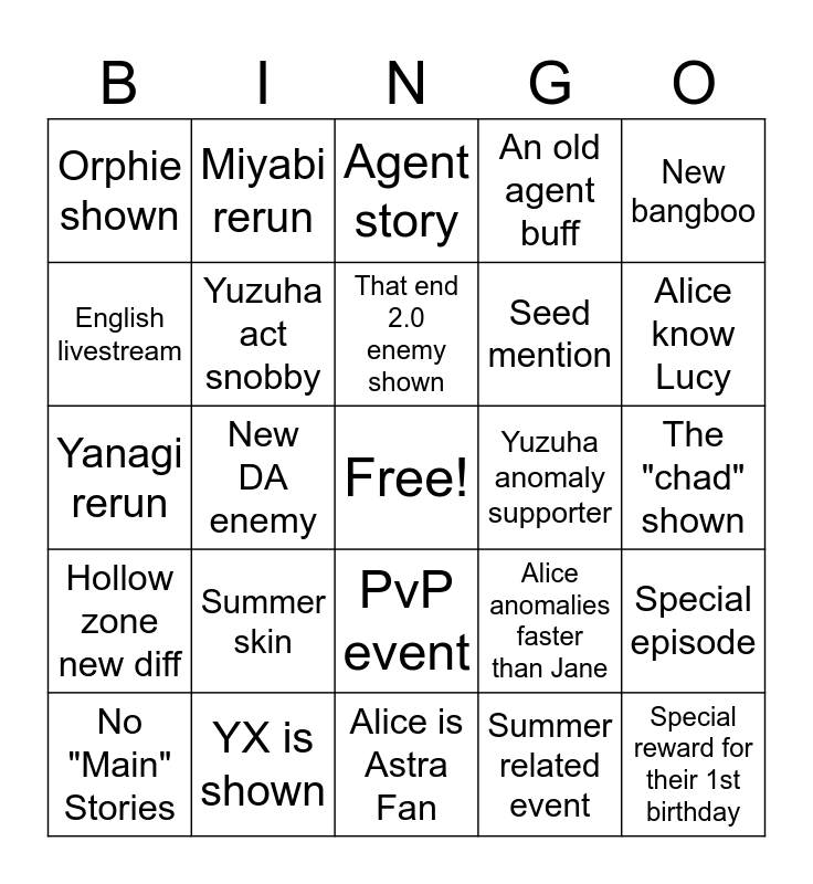 This bingo card has a free space and 24 words: Summer skin, YX is shown, That end 2.0 enemy shown, No "Main" Stories, New bangboo, Orphie shown, English livestream, Miyabi rerun, Yuzuha anomaly supporter, PvP event, Seed mention, Yanagi rerun, Alice anomalies faster than Jane, Special episode, Yuzuha act snobby, Summer related event, The "chad" shown, Agent story, Alice know Lucy, New DA enemy, Special reward for their 1st birthday, Hollow zone new diff, An old agent buff and Alice is Astra Fan.