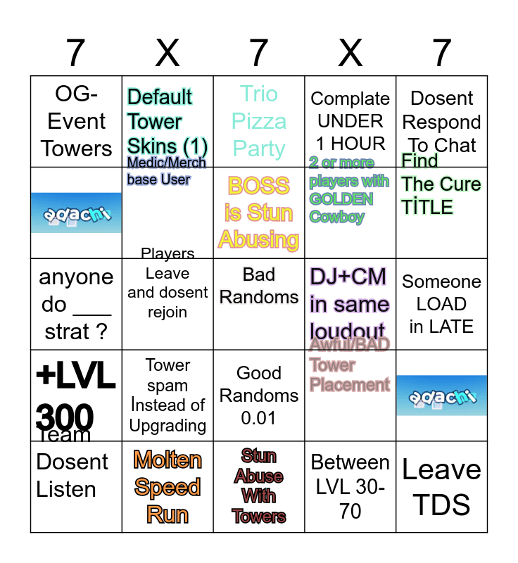 This bingo card has 2 images and 23 words: +LVL 300, Molten Speed Run, Bad Randoms, Between LVL 30- 70, Dosent Respond To Chat, OG- Event Towers, Default Tower Skins (1), Trio Pizza Party, DJ+CM in same loudout, Medic/Merch base User, Stun Abuse With Towers, Awful/BAD Tower Placement, Find The Cure TİTLE, Team Dosent Listen, Players Leave and dosent rejoin, BOSS is Stun Abusing, 2 or more players with GOLDEN Cowboy, Someone LOAD in LATE, anyone do ___ strat ?, Tower spam İnstead of Upgrading, Good Randoms 0.01, Complate UNDER 1 HOUR and Leave TDS.