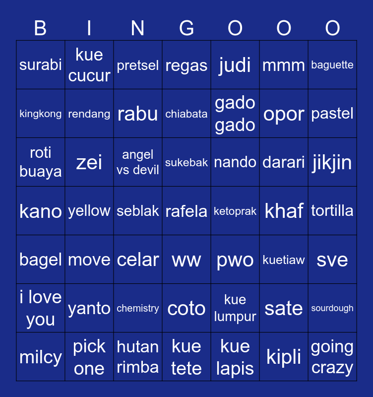 This bingo card has a free space and 48 words: kue lumpur, opor, kue tete, yellow, angel vs devil, tortilla, kue cucur, pick one, mmm, ww, baguette, regas, darari, nando, i love you, khaf, kingkong, pastel, sate, judi, gado gado, seblak, surabi, rendang, sourdough, rabu, jikjin, milcy, sukebak, zei, kipli, ketoprak, sve, yanto, kano, pwo, kuetiaw, roti buaya, celar, chemistry, bagel, going crazy, pretsel, hutan rimba, chiabata, coto, move and kue lapis.