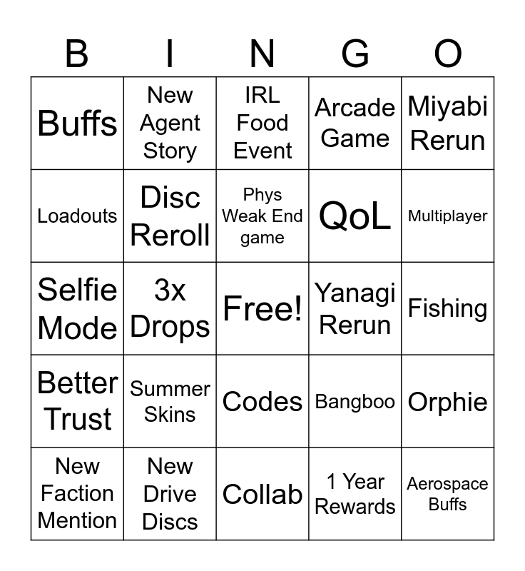 This bingo card has a free space and 24 words: Summer Skins, New Drive Discs, Phys Weak End game, New Faction Mention, Miyabi Rerun, Buffs, Loadouts, New Agent Story, Yanagi Rerun, Codes, QoL, Selfie Mode, Bangboo, Orphie, Disc Reroll, 1 Year Rewards, Fishing, IRL Food Event, Multiplayer, 3x Drops, Aerospace Buffs, Better Trust, Arcade Game and Collab.