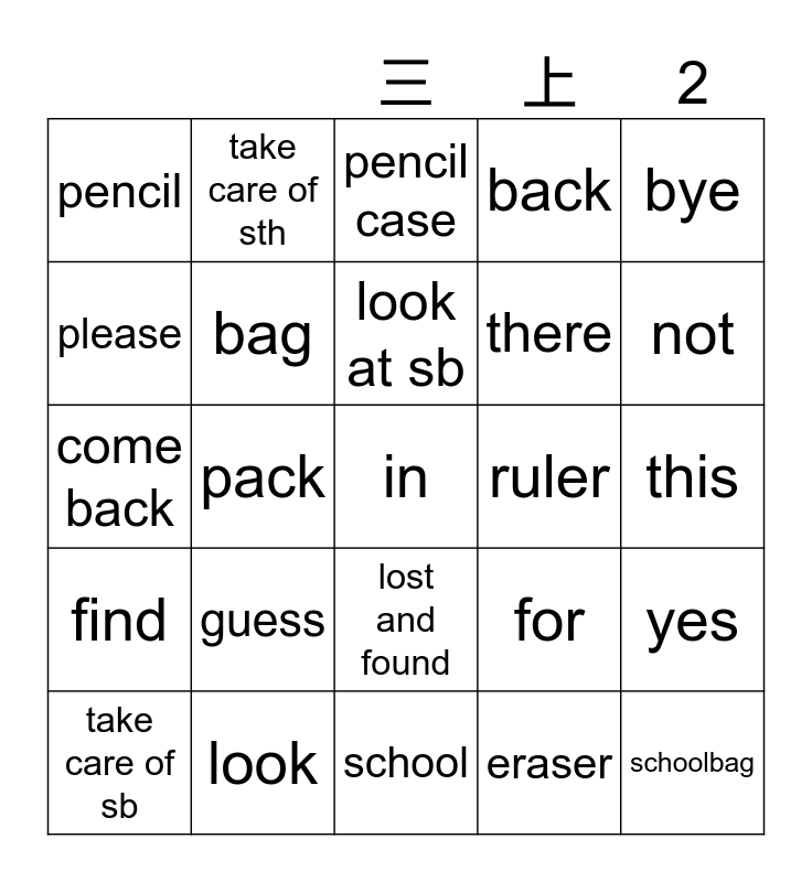 This bingo card has 31 words: school, thing, pack, pen, pencil, pencil case, bag, for, ruler, eraser, this, in, schoolbag, it, not, that, yes, guess, find, lost and found, bye, kid, take care of sb, take care of sth, there, please, back, come back, look, look at sb and look at sth.