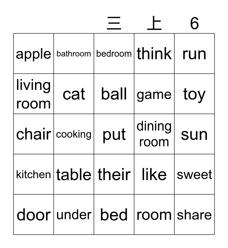 This bingo card has 28 words: sweet, home, game, room, living room, bedroom, bathroom, kitchen, dining room, door, chair, think, under, bed, toy, miaow, table, cat, ball, their, apple, share, put, cooking, sun, like, run and lucky.