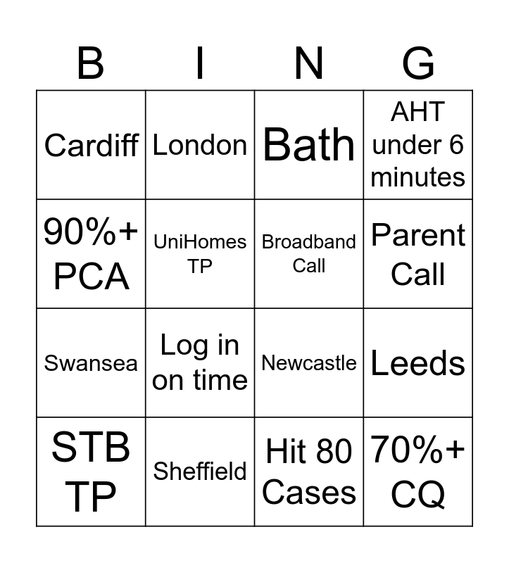 This bingo card has 16 words: Sheffield, Leeds, Bath, Cardiff, Swansea, London, Newcastle, Hit 80 Cases, 90%+ PCA, UniHomes TP, STB TP, AHT under 6 minutes, Log in on time, Parent Call, Broadband Call and 70%+ CQ.