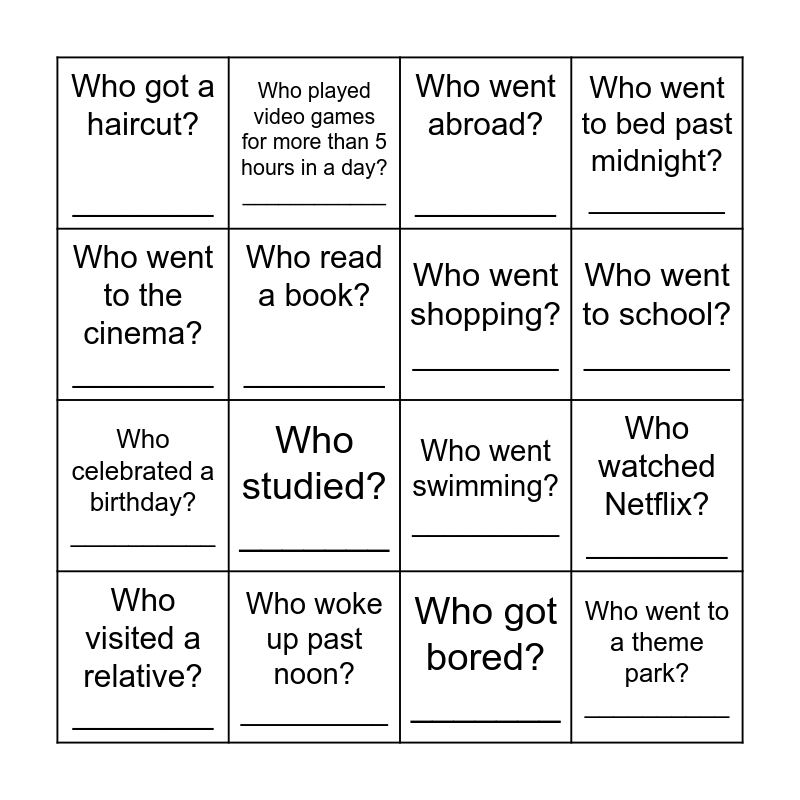 This bingo card has 16 words: Who woke up past noon? _________, Who watched Netflix? ________, Who went abroad? ________, Who got a haircut? ________, Who celebrated a birthday? __________, Who played video games for more than 5 hours in a day? ____________, Who went swimming? _________, Who got bored? _______, Who went to the cinema? ________, Who read a book? ________, Who visited a relative? ________, Who went to bed past midnight? ________, Who studied? _______, Who went to school? ________, Who went shopping? ________ and Who went to a theme park? __________.