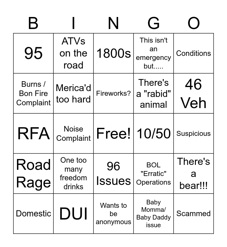 This bingo card has a free space and 24 words: One too many freedom drinks, DUI, Fireworks?, Domestic, Conditions, 95, Burns / Bon Fire Complaint, ATVs on the road, 10/50, 96 Issues, There's a "rabid" animal, RFA, BOL "Erratic" Operations, There's a bear!!!, Merica'd too hard, Baby Momma/ Baby Daddy issue, Suspicious, 1800s, 46 Veh, Noise Complaint, Scammed, Road Rage, This isn't an emergency but..... and Wants to be anonymous.
