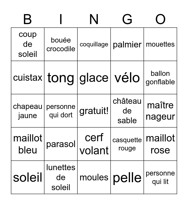This bingo card has a free space and 24 words: parasol, lunettes de soleil, glace, soleil, mouettes, coup de soleil, cuistax, bouée crocodile, château de sable, cerf volant, vélo, chapeau jaune, casquette rouge, maillot rose, tong, pelle, maître nageur, coquillage, ballon gonflable, personne qui dort, personne qui lit, maillot bleu, palmier and moules.