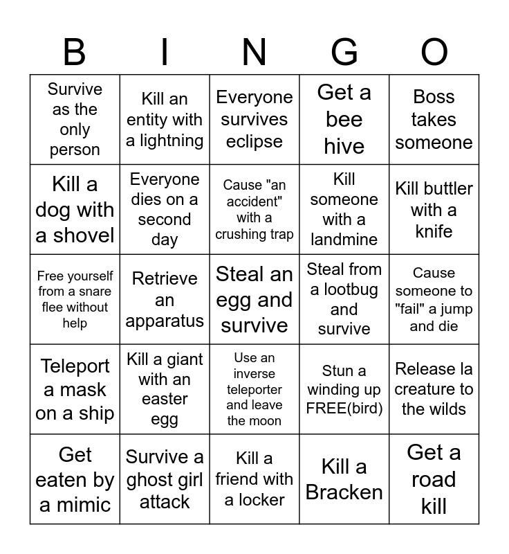 This bingo card has 25 words: Kill a giant with an easter egg, Kill a friend with a locker, Cause "an accident" with a crushing trap, Get eaten by a mimic, Boss takes someone, Survive as the only person, Kill a dog with a shovel, Kill an entity with a lightning, Steal from a lootbug and survive, Use an inverse teleporter and leave the moon, Kill someone with a landmine, Free yourself from a snare flee without help, Stun a winding up FREE(bird), Release la creature to the wilds, Everyone dies on a second day, Get a road kill, Cause someone to "fail" a jump and die, Everyone survives eclipse, Kill buttler with a knife, Retrieve an apparatus, Steal an egg and survive, Survive a ghost girl attack, Teleport a mask on a ship, Get a bee hive and Kill a Bracken.
