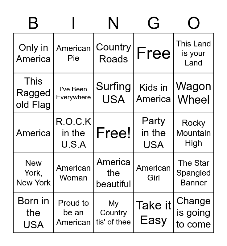 This bingo card has a free space and 24 words: American Woman, Proud to be an American, Surfing USA, Born in the USA, This Land is your Land, Only in America, This Ragged old Flag, American Pie, Party in the USA, America the beautiful, Kids in America, America, American Girl, The Star Spangled Banner, I've Been Everywhere, Take it Easy, Rocky Mountain High, Country Roads, Wagon Wheel, R.O.C.K in the U.S.A, Change is going to come, New York, New York, Free and My Country tis' of thee.