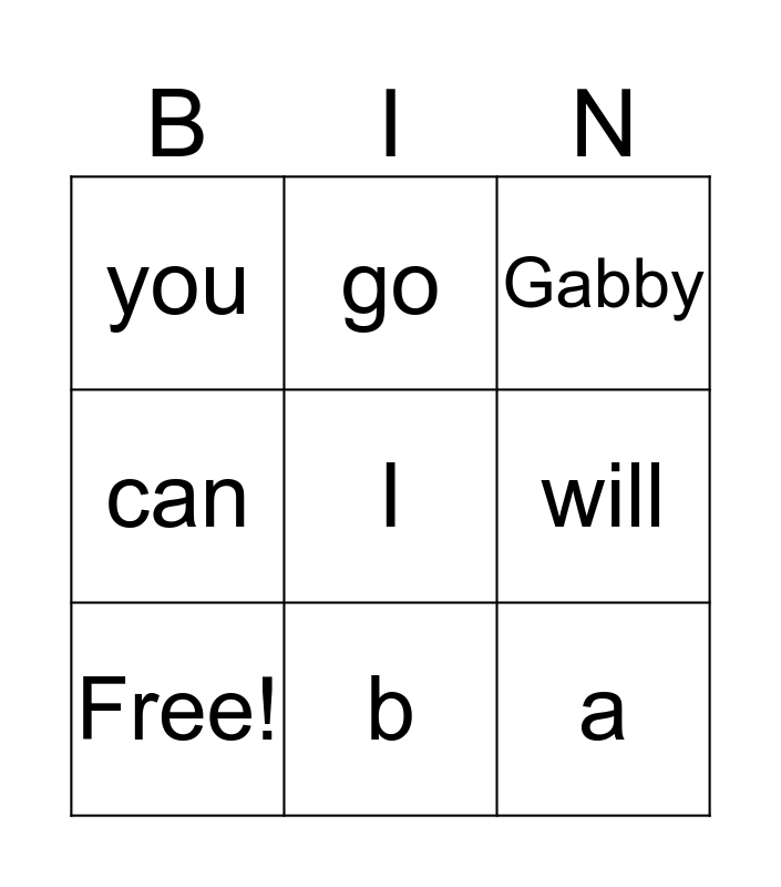 This bingo card has 9 words: Free!, Gabby, go, can, you, will, I, a and b.