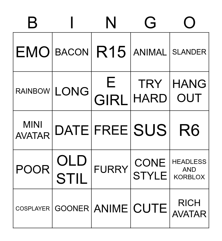 This bingo card has a free space and 24 words: OLD STIL, GOONER, E GIRL, COSPLAYER, SLANDER, EMO, RAINBOW, BACON, SUS, FURRY, TRY HARD, MINI AVATAR, CONE STYLE, HEADLESS AND KORBLOX, LONG, CUTE, R6, R15, HANG OUT, DATE, RICH AVATAR, POOR, ANIMAL and ANIME.
