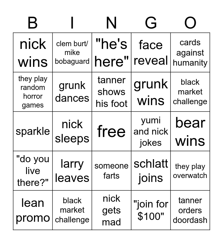 This bingo card has a free space and 24 words: lean promo, larry leaves, tanner shows his foot, "join for $100", cards against humanity, nick wins, clem burt/ mike bobaguard, "he's here", yumi and nick jokes, bear wins, sparkle, grunk dances, schlatt joins, they play overwatch, they play random horror games, black market challenge, nick gets mad, face reveal, black market challenge, "do you live there?", nick sleeps, someone farts, grunk wins and tanner orders doordash.