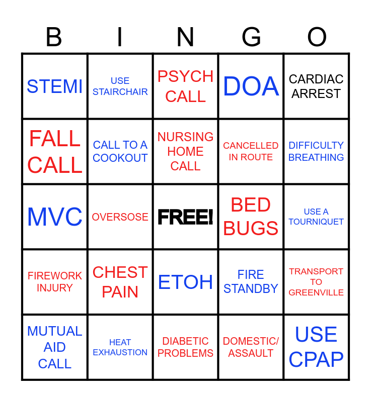 This bingo card has a free space and 24 words: CHEST PAIN, HEAT EXHAUSTION, NURSING HOME CALL, MUTUAL AID CALL, CARDIAC ARREST, STEMI, FALL CALL, USE STAIRCHAIR, BED BUGS, ETOH, CANCELLED IN ROUTE, MVC, FIRE STANDBY, TRANSPORT TO GREENVILLE, CALL TO A COOKOUT, DOMESTIC/ ASSAULT, USE A TOURNIQUET, PSYCH CALL, DIFFICULTY BREATHING, OVERSOSE, USE CPAP, FIREWORK INJURY, DOA and DIABETIC PROBLEMS.