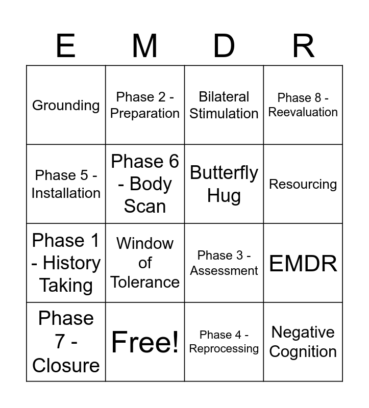 This bingo card has 16 words: Free!, EMDR, Bilateral Stimulation, Grounding, Phase 1 - History Taking, Phase 2 - Preparation, Phase 3 - Assessment, Phase 4 - Reprocessing, Phase 5 - Installation, Phase 6 - Body Scan, Phase 7 - Closure, Phase 8 - Reevaluation, Window of Tolerance, Resourcing, Butterfly Hug and Negative Cognition.