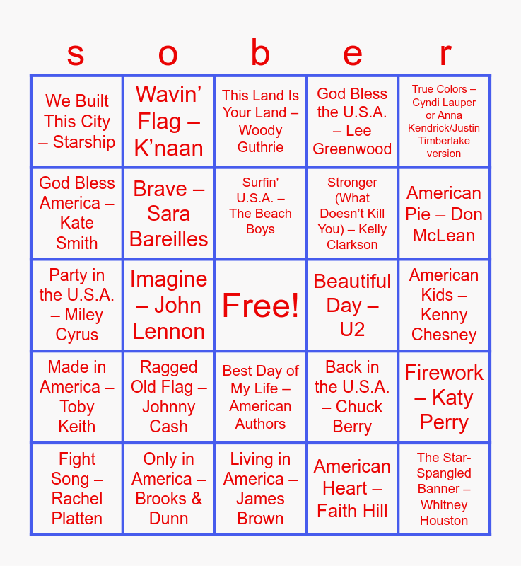 This bingo card has a free space and 40 words: Put a Little Love in Your Heart – Jackie DeShannon, Imagine – John Lennon, Lean on Me – Bill Withers, Beautiful Day – U2, Rise Up – Andra Day, Fight Song – Rachel Platten, Brave – Sara Bareilles, Freedom – Reba McEntire, Stronger (What Doesn’t Kill You) – Kelly Clarkson, Firework – Katy Perry, Party in the U.S.A. – Miley Cyrus, Wavin’ Flag – K’naan, American Heart – Faith Hill, American Kids – Kenny Chesney, Made in America – Toby Keith, Ragged Old Flag – Johnny Cash, American Soldier – Toby Keith, God Bless the U.S.A. – Lee Greenwood, Where the Stars and Stripes and the Eagle Fly – Aaron Tippin, We Built This City – Starship, Only in America – Brooks & Dunn, Surfin' U.S.A. – The Beach Boys, Back in the U.S.A. – Chuck Berry, American Pie – Don McLean, R.O.C.K. in the U.S.A. – John Mellencamp, American Woman – The Guess Who, Living in America – James Brown, Born in the U.S.A. – Bruce Springsteen, The Stars and Stripes Forever – John Philip Sousa, You're a Grand Old Flag – George M. Cohan, Yankee Doodle Dandy – Traditional, This Land Is Your Land – Woody Guthrie, America the Beautiful – Ray Charles, The Star-Spangled Banner – Whitney Houston, God Bless America – Kate Smith, Color Me America – Dolly Parton, Best Day of My Life – American Authors, Take Me Home Country Roads- John Denver, True Colors – Cyndi Lauper or Anna Kendrick/Justin Timberlake version and My Wish - Rascal Flatts.