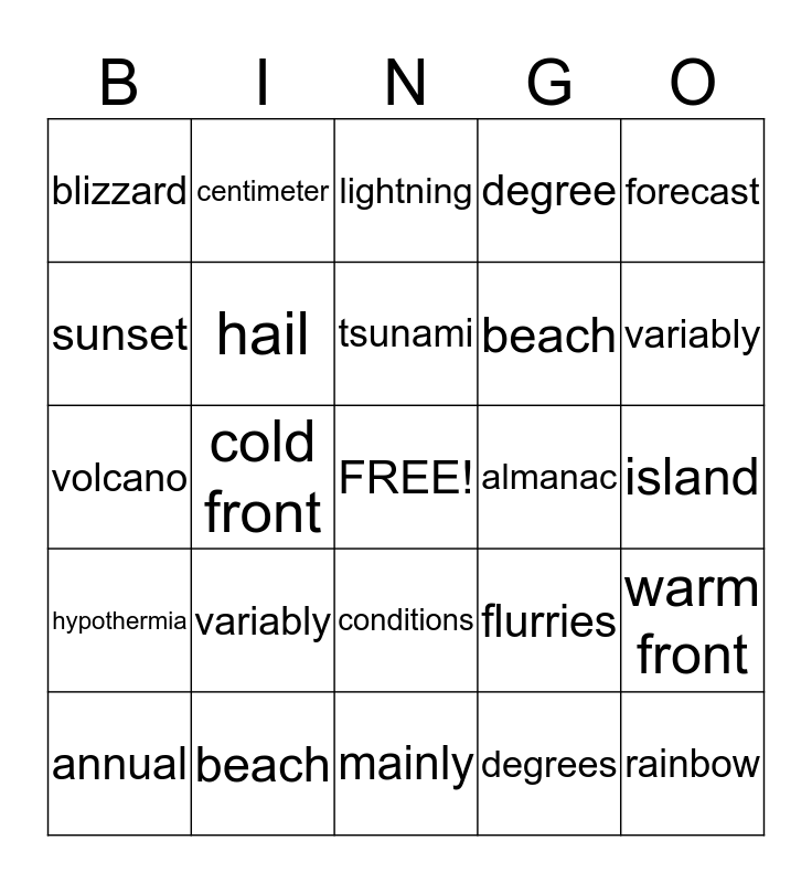 This bingo card has a free space and 46 words: celsius, rainbow, earthquake, mainly, variably, humidity, centimeter, windchill, sunset, tornado, hail, degree, warm front, flurries, cloudy, precipitation, tsunami, almanac, showers, forecast, cold front, degrees, blizzard, beach, cloudy, variably, annual, humidity, conditions, hypothermia, weather, prairie, desert, ocean, tide, beach, island, mountain, typhoon, hurricane, thunderstorm, lightning, volcano, sunrise, high and low.
