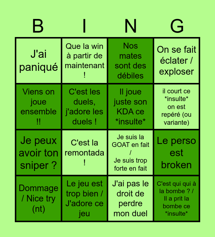 This bingo card has 16 words: Le jeu est trop bien / J'adore ce jeu, Le perso est broken, Nos mates sont des débiles, J'ai paniqué, Je peux avoir ton sniper ?, Que la win à partir de maintenant !, Je suis la GOAT en fait / Je suis trop forte en fait, J'ai pas le droit de perdre mon duel, Viens on joue ensemble !!, C'est les duels, j'adore les duels !, Dommage / Nice try (nt), On se fait éclater / exploser, C'est la remontada !, il court ce *insulte* on est repéré (ou variante), Il joue juste son KDA ce *insulte* and C'est qui qui à la bombe ? / Il a prit la bombe ce *insulte*.