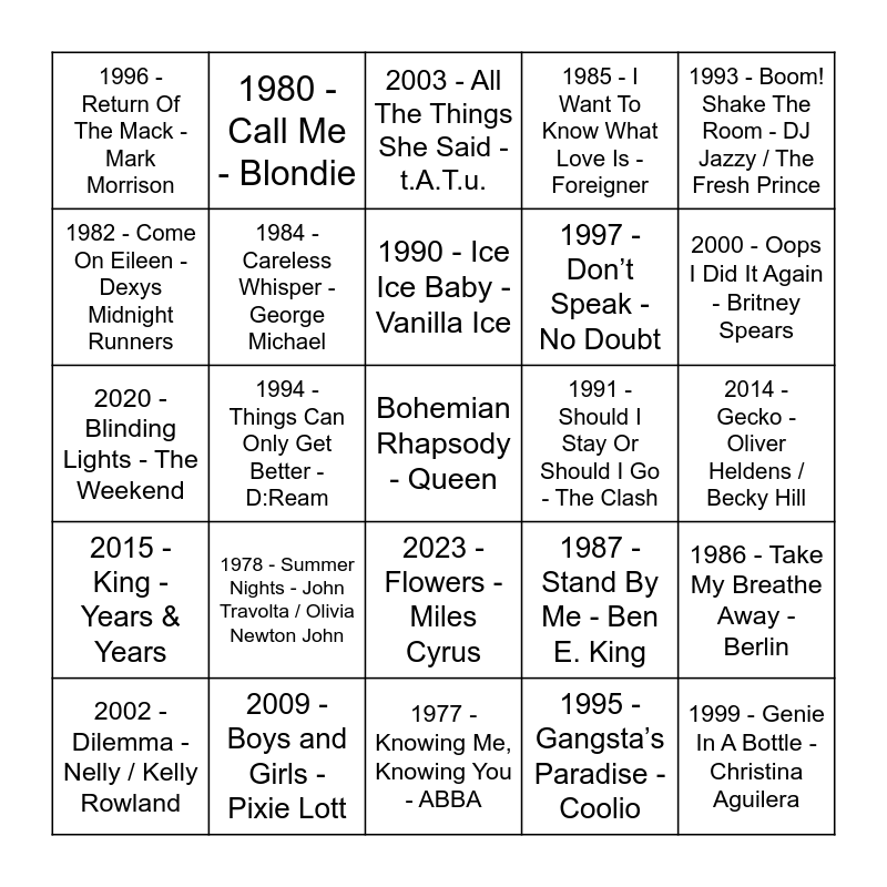 This bingo card has 51 words: Free!, Bohemian Rhapsody - Queen, 1976 - Mamma Mia - ABBA, 1977 - Knowing Me, Knowing You - ABBA, 1978 - Summer Nights - John Travolta / Olivia Newton John, 1979 - Another Brick In The Wall - Pink Floyd, 1980 - Call Me - Blondie, 1981 - Tainted Love - Soft Cell, 1982 - Come On Eileen - Dexys Midnight Runners, 1983 - Billie Jean - Michael Jackson, 1984 - Careless Whisper - George Michael, 1985 - I Want To Know What Love Is - Foreigner, 1986 - Take My Breathe Away - Berlin, 1987 - Stand By Me - Ben E. King, 1988 - Heaven Is A Place On Earth - Belinda Carlisle, 1989 - Like A Prayer - Madonna, 1990 - Ice Ice Baby - Vanilla Ice, 1991 - Should I Stay Or Should I Go - The Clash, 1992 - Rhythm Is A Dancer - Snap, 1993 - Boom! Shake The Room - DJ Jazzy / The Fresh Prince, 1994 - Things Can Only Get Better - D:Ream, 1995 - Gangsta’s Paradise - Coolio, 1996 - Return Of The Mack - Mark Morrison, 1997 - Don’t Speak - No Doubt, 1998 - My Heart Will Go On - Celina Dion, 1999 - Genie In A Bottle - Christina Aguilera, 2000 - Oops I Did It Again - Britney Spears, 2001 - Don’t Stop Movin - S Club, 2002 - Dilemma - Nelly / Kelly Rowland, 2003 - All The Things She Said - t.A.T.u., 2004 - Five Colours In Her Hair - McFly, 2005 - I Bet You Look Good On The Dancefloor - Artic Monkeys, 2006 - Crazy - Knarls Barkley, 2007 - The Way I Are - Timberland / Keri Hilson, 2008 - American Boy - Kanye West / Estelle, 2009 - Boys and Girls - Pixie Lott, 2010 - Dynamite - Taio Cruz, 2011 - Louder - DJ Fresh, 2012 - Spectrum - Florence And The Machine, 2013 - Animals - Martin Garrix, 2014 - Gecko - Oliver Heldens / Becky Hill, 2015 - King - Years & Years, 2016 - Closer - The Chainsmokers / Halsey, 2017 - Shape Of You - Ed Sheeran, 2018 - Shallow - Lady Gaga / Bradley Cooper, 2019 - Old Town Road - Lil Nas x, 2020 - Blinding Lights - The Weekend, 2021 - Cold Heart - Dua Lipa / Elton John, 2022 - Running Up That Hill - Kate Bush, 2023 - Flowers - Miles Cyrus and 2024 - Too Sweet.