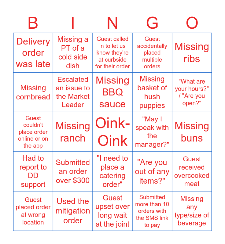 This bingo card has a free space and 24 words: Submitted an order over $300, Used the mitigation order, Missing BBQ sauce, Guest placed order at wrong location, Missing ribs, Delivery order was late, Missing cornbread, Missing a PT of a cold side dish, "May I speak with the manager?", "I need to place a catering order", Missing basket of hush puppies, Guest couldn't place order online or on the app, "Are you out of any items?", Guest received overcooked meat, Escalated an issue to the Market Leader, Submitted more than 10 orders with the SMS link to pay, Missing buns, Guest called in to let us know they're at curbside for their order, "What are your hours?" / "Are you open?", Missing ranch, Missing any type/size of beverage, Had to report to DD support, Guest accidentally placed multiple orders and Guest upset over long wait at the joint.