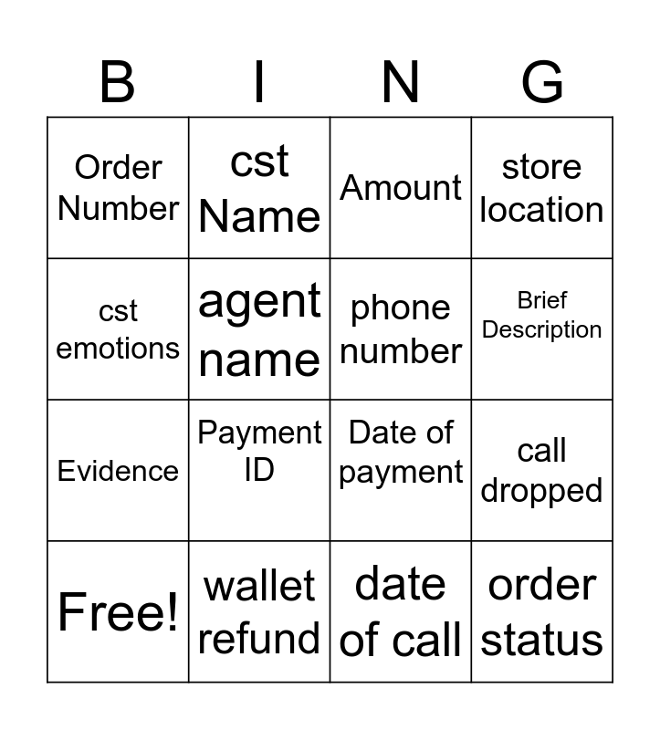 This bingo card has 21 words: Free!, Merchant Name, agent name, date of call, call dropped, Order Number, cst Name, Amount, store location, cst emotions, age, phone number, order status, call URL, wallet refund, Customer ID, Brief Description, Evidence, Payment ID, Date of payment and ticket number.