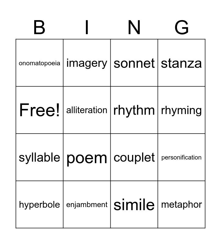 This bingo card has 16 words: enjambment, personification, sonnet, onomatopoeia, syllable, imagery, couplet, simile, Free!, alliteration, hyperbole, stanza, poem, rhyming, rhythm and metaphor.